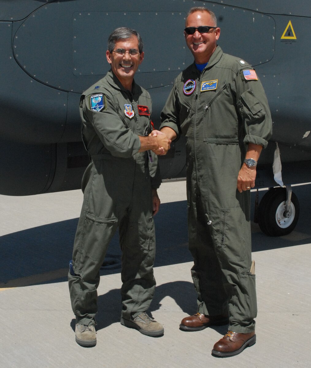 BEALE AIR FORCE BASE, Calif. -- Lt. Col. Steven Edgar from the 1st Reconnaissance Squadron and Navy Cmdr. Wes Naylor from the Broad Area Maritime Surveillance Program Office at Naval Air Station Patuxent River shake hands in front of an RQ-4 Global Hawk during the first ever Air Force, Navy Joint Cockpit Working Group meeting, Aug. 3 through 5 at Beale Air Force Base. (U.S. Air Force photo/Tech. Sgt. Luke Johnson)