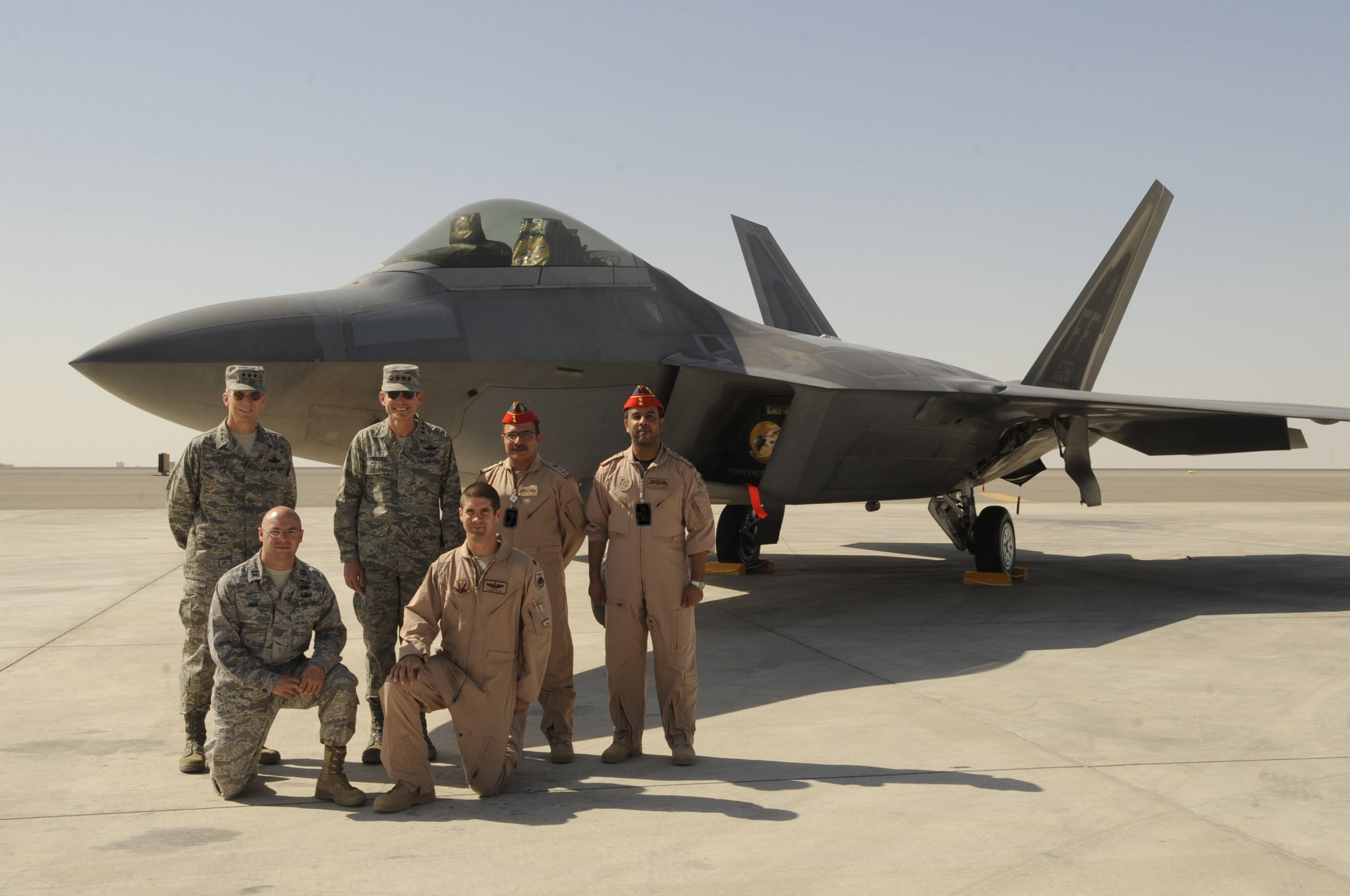 SOUTHWEST ASIA -- Gen. Norton Schwartz, U.S. Air Force Chief of Staff, and Lt. Gen. Mike Hostage, U.S. Air Forces Central Command commander, pose with Emirati military members and crew members from Langley Air Force Base, Va., Nov. 13, in front of an F-22 Raptor during the aircraft's first visit to the Gulf region. U.S. Air Force F-22s are participating in bilateral training opportunities with coalition partners at the United Arab Emirates Air Warfare Center through Dec. 10. The training is intended to strengthen military-to-military relationships in the region, promote regional security, improve tactical air operations, and enhance interoperability of forces, equipment and procedures. (U.S. Air Force photo/2nd Lt. Kidron B. Vestal)