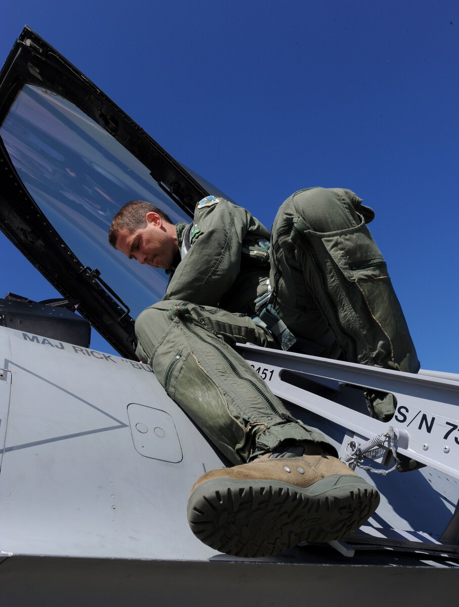 LANGLEY AIR FORCE BASE, Va. – Airman 1st Class Mike Daigneault, 158th Fighter Wing crew chief, clears Lt. Col. Frank Marston, 158th Fighter Wing Alert Detachment 1 commander, for takeoff Oct. 28. The aircraft, an F-16C Fighting Falcon, carries a fourth-generation advanced targeting LITENING pod, which will be tested for the first time during the two-week exercise Bold Quest 2009, an advanced concept technology demonstration. (U.S. Air Force photo/Airman Rebecca Montez)