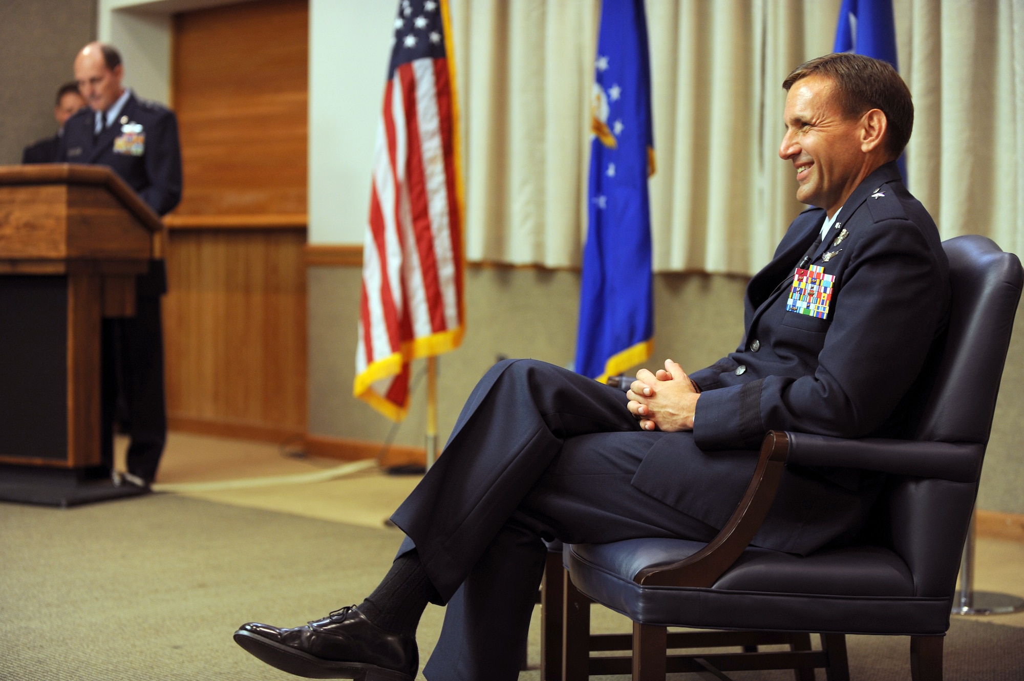 Retired Maj. Gen. Lawrence Johnston, former U.S Air force Warfare Center commander, administers the oath of office to the recently promoted Maj. Gen. Ted Kresge, USAFWC commander, during his promotion ceremony Aug. 10 at Nellis Air Force Base, Nev. The USAFWC's mission is to shape the way our force fights through operational testing, tactics development, and advanced training in air, space, and cyberspace at the operational and tactical levels. (U.S. Air Force Photo/Tech. Sgt. Michael R. Holzworth)