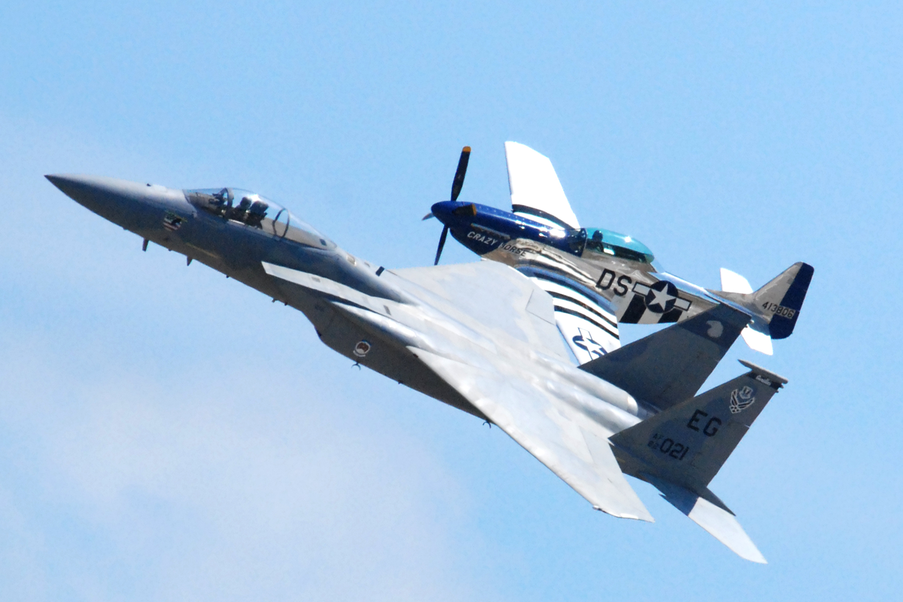 EGLIN AIR FORCE BASE, Fla. -- Tech. Sgt. Michael Pallone, 33rd Maintenance Squadron, looks over a P-51 Mustang during the final flight for the F-15 West Coast Demonstration Team to hundreds of base and community spectators here May 1. The P-51 Mustang was assigned to the fighter wing from 1948 through 1950, and was on hand to fly as part of the 33rd Fighter Wing?s Heritage Flight. The Air Combat Command F-15C demo team has performed more than 150 times to spectators around the globe over the final two years. This is the final demonstration for the F-15C Eagle completing a 26-year career, which began in 1983. (U.S. Air Force photo by Staff Sgt. Mike Meares)