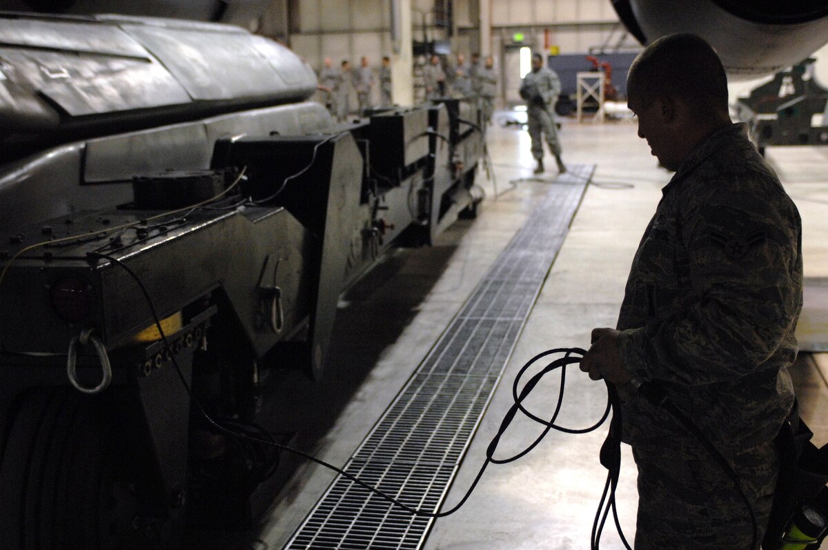 MINOT AIR FORCE BASE, N.D. -- Airman First Class Brady Fender, 5th Aircraft Maintenance Squadron weapons load crew member, expertly manages the power control unit dead-man switch in one hand, while he prevents the grounding wire from getting caught in the Munitions Handling Unit-196/M trailer, as his team approaches the tail end of the load crew competition here Feb. 3. (U.S. Air Force photo by Senior Airman Kelly Timney)