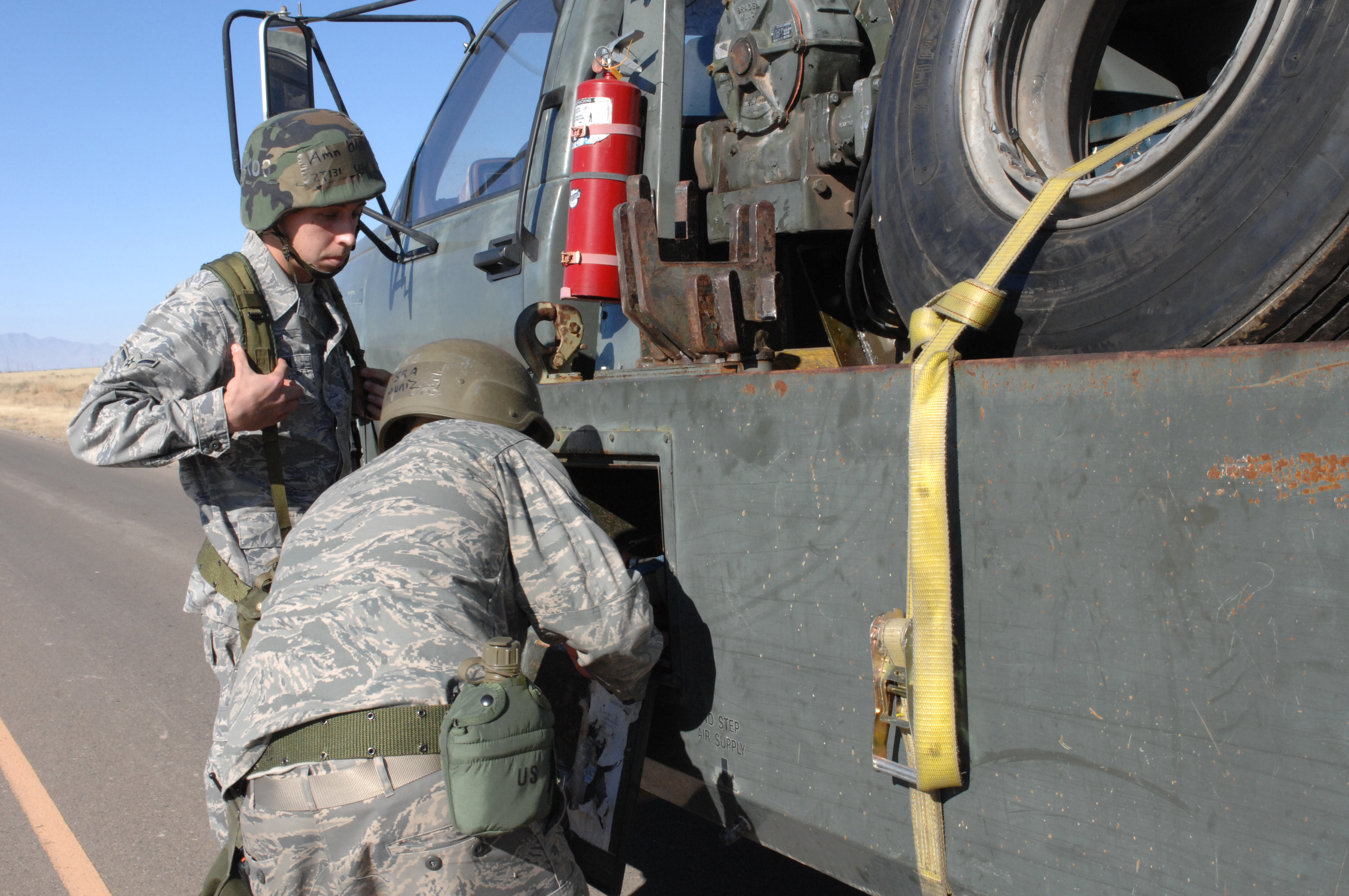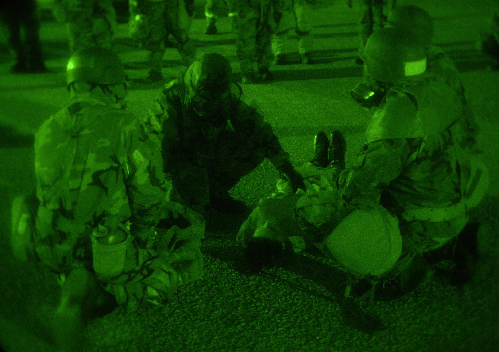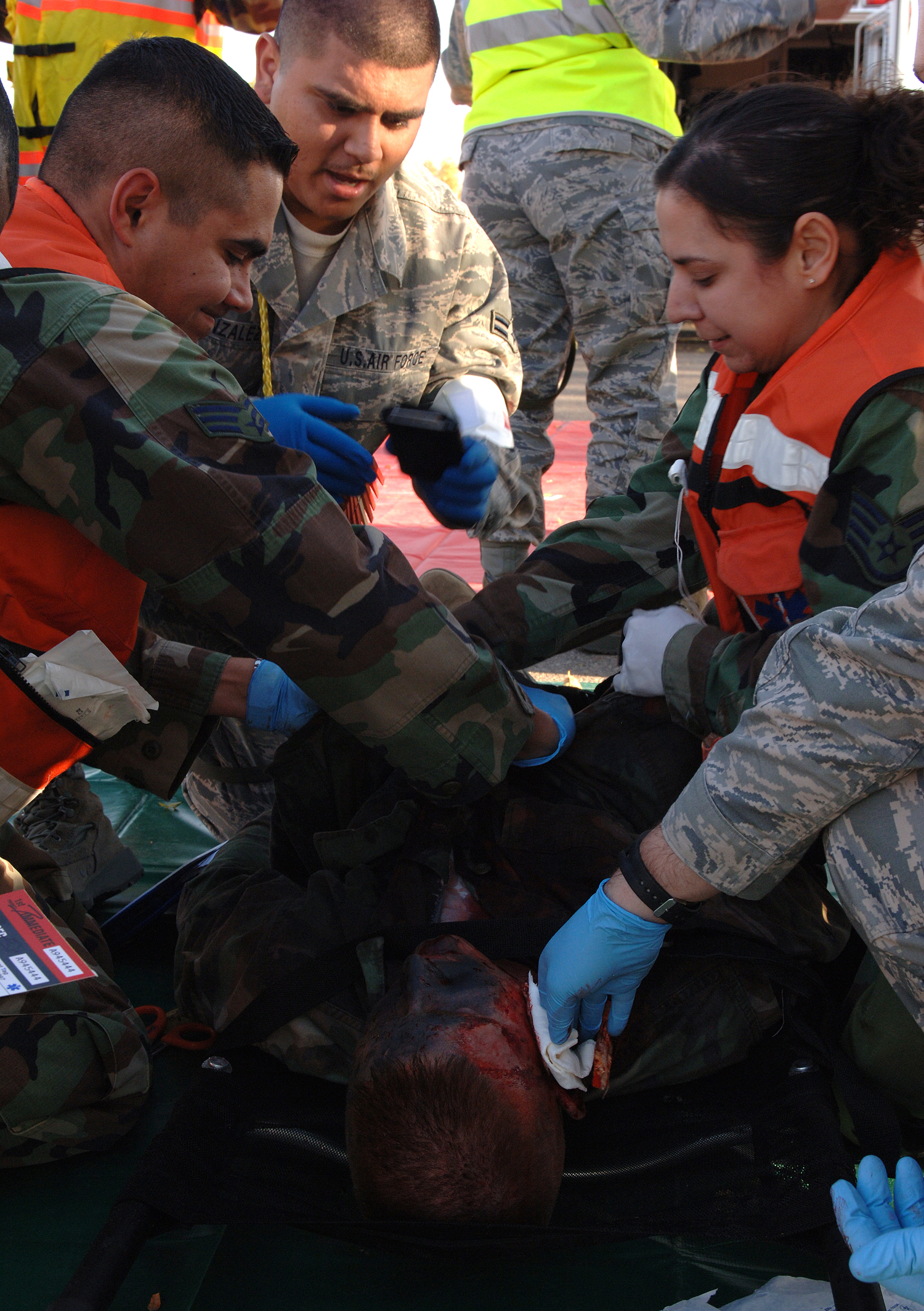 Senior Airman Sean Cooper, 49th Force Support Squadron, simulates chemical burns on his hands while crawling out of a room in the Military Personnel Flight (MPF) building during a phase II exercise at Holloman Air Force Base, N.M., Nov. 19. The scenario was that a room in the MPF building exploded while the base was under attack. Many Airmen had to perform self-aid and buddy care while in mission oriented protective posture (MOPP) 4, which included a chemical suit, boots, gloves and a gas mask. (U.S. Air Force photo/Airman Sondra M. Escutia)