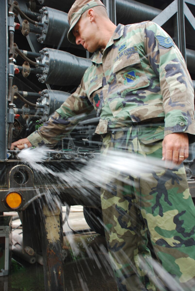 SOTO CANO AIR BASE, Honduras - Air Force Tech. Sgt. Shane Bolles, deployed from Dyess Air Force Base, Texas, works on a water filtration machine Oct. 29. Servicemembers from Joint Task Force-Bravo are participating in a 10-day operation in a nearby community to filter well water. The well water became undrinkable after more than a week long stretch of rain caused flooding in the area. (U.S. Air Force photo by Staff Sgt. Joel Mease)