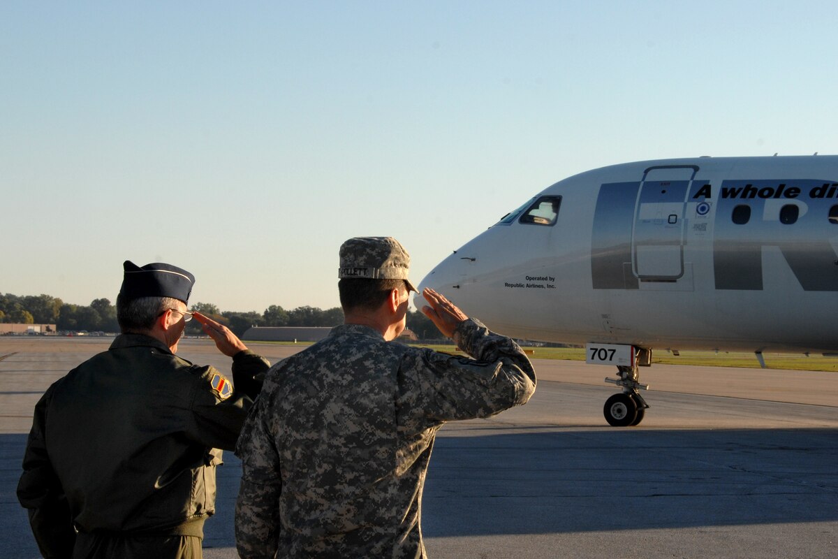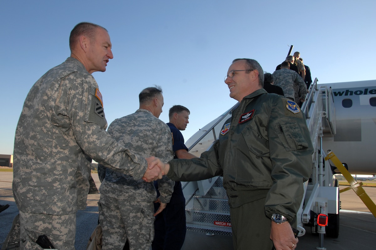 OFFUTT AIR FORCE BASE, Neb. -- Colonel Robert L. Maness, vice commander 55th Wing, bids farewell to Rear Adm. Joseph F. Campbell, U.S. Fleet Forces Command, Director of Fleet Maintenance, following a three-day, CAPSTONE tour of U.S. Strategic Command Headquarters. Attendees departed Offutt AFB, Neb., Oct 10. CAPSTONE is a Department of Defense joint service professional military education course for newly promoted brigadier generals and rear admirals serving in the U.S. military. (U.S. Air Force Photo By Josh Plueger)