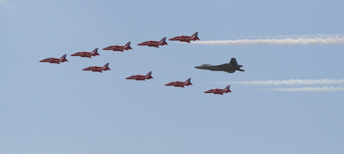 LANGLEY AIR FORCE BASE, Va. – Maj. Paul "Max" Moga, F-22A Raptor Demonstration Team pilot, flies in formation with British Royal Air Force Aerobatic Team, The Red Arrows, during an afternoon practice flight here June 18. Both demonstration teams will perform at AirPower over Hampton Roads, Langley’s air show, which is scheduled for June 20 to 22. (U.S. Air Force photo/Staff Sgt. Samuel Rogers)