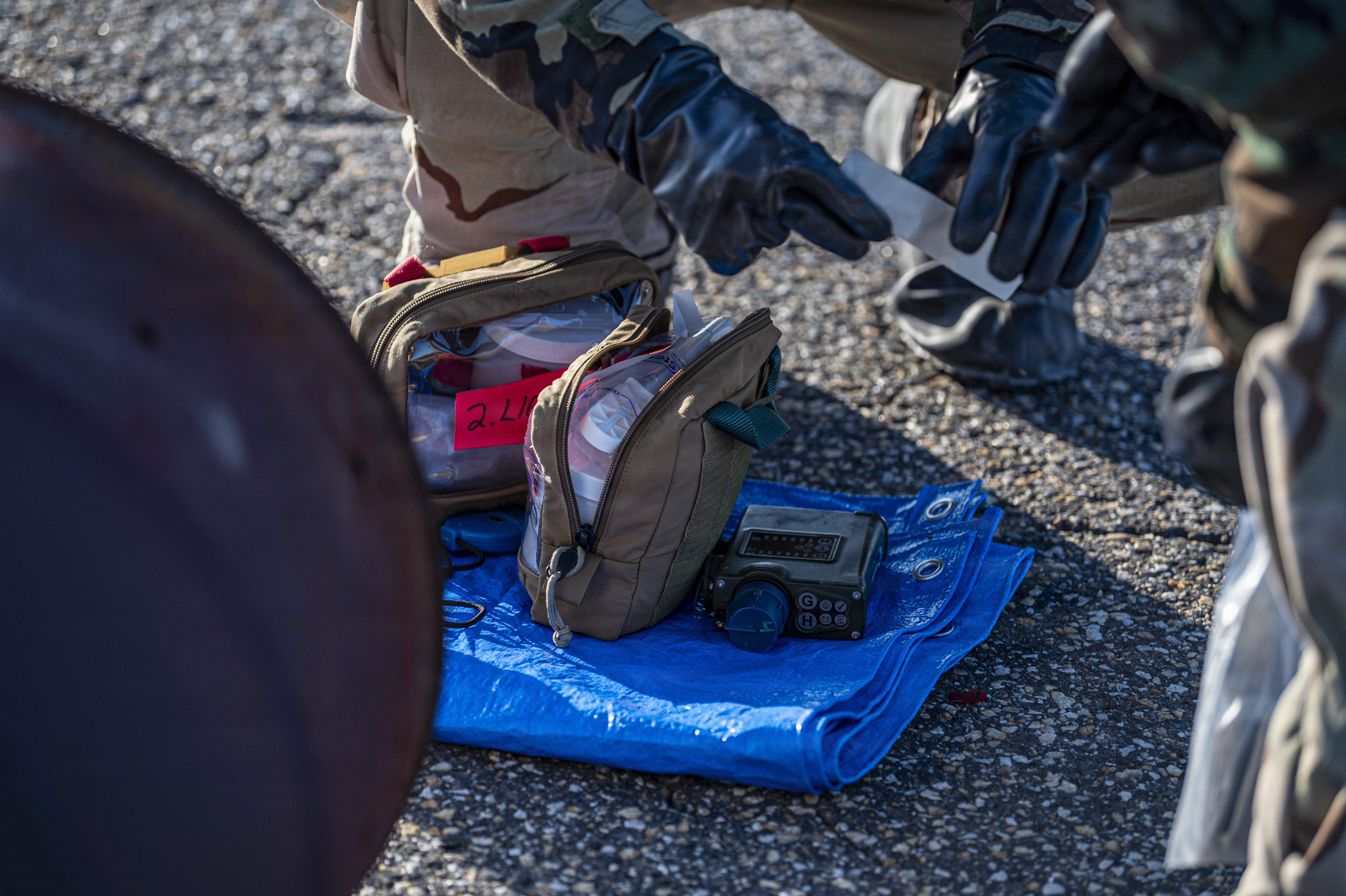 Minutes after Heitzmann reported the threat, security forces established a cordon and a hazardous material team arrived and began inspecting and determining the chemical makeup. With these steps complete, wing inspectors closed the scenario. And while the exercise players didn’t always make the right choice, the focus was on learning and strengthening standard operating procedures.