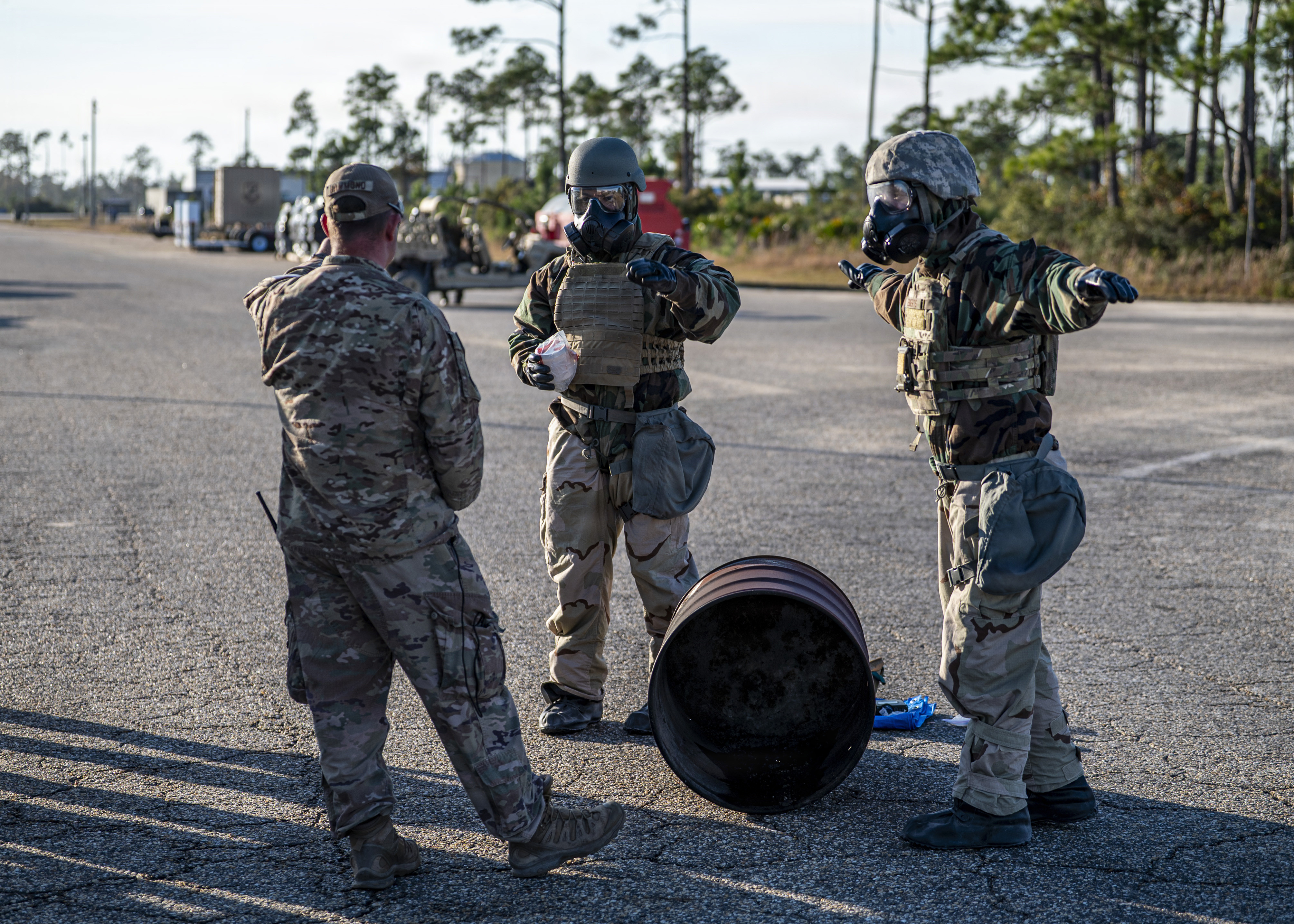 “The ability to recognize the signs and symptoms from possible chemical exposure, understanding the implications behind an intelligence drop from open-source news reporting, paired with the obvious visible signs of what could be a chemical attack can be the difference between life and death,” said Tech. Sgt. Ben Hammond, 23d Wing wing inspection team member. “Like in this exercise scenario, if we go into an area where there’s any potential of a chemical attack, I’m on edge, looking for any signs that are out of place, like a barrel in the middle of the road that matches an intel of concern.”