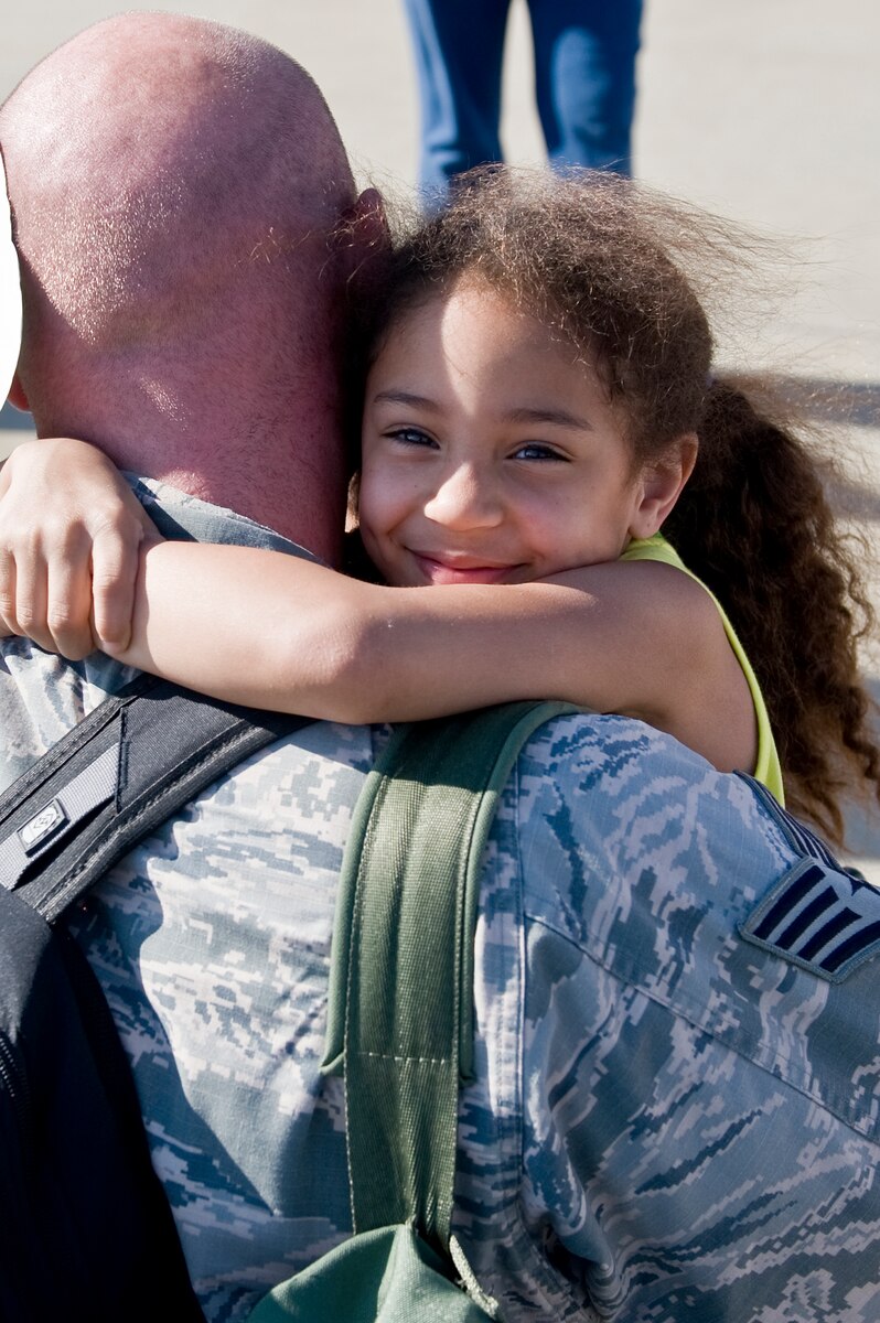 Col. Lamar Pettus, 4th Fighter Wing vice commander, welcomes home Senior Airman Joshua Sears, 4th Equipment Maintenance Squadron repair and reclamation technician, from a deployment, April 5, 2014, at Seymour Johnson Air Force Base, N.C. Sears, along with nearly 300 other Airmen, were deployed to the 380th Air Expeditionary Wing in Southwest Asia to enhance regional partnerships, support security exercises, and demonstrate a continued commitment to area security and stability. (U.S. Air Force photo/Airman 1st Class Brittain Crolley)