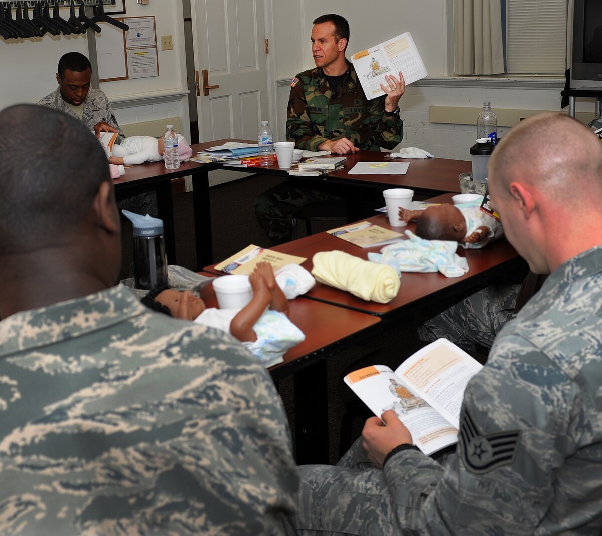 U.S. Air Force Master Sgt. Byron Rauch, father of three and currently expecting his fourth daughter, assists Master Sgt. Ralph Oliver, 45th Intelligence Squadron first sergeant, and soon to be first-time father, in swaddling a doll representing a newborn child during a New Fathers Workshop at Langley Air Force Base, Va. April 11, 2013. The workshop was provided as a way to help prepare new and expecting fathers for their journey into fatherhood. (U.S. Air Force photo by Senior Airman Teresa Aber/Released)