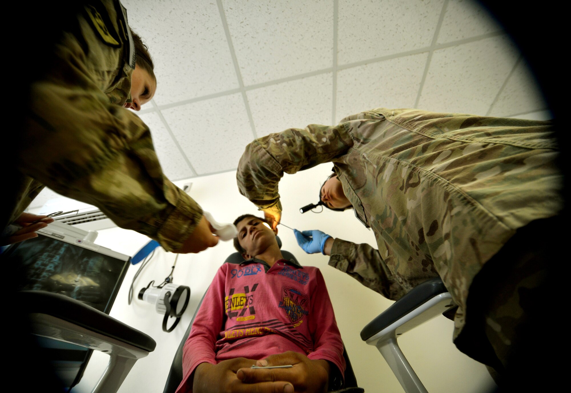 U.S. Air Force Maj. Jamie Swartz, second from right, examines a patient’s stitches and incision during a follow-up appointment in the Korean humanitarian hospital on Bagram Airfield, Afghanistan, July 30, 2013. Swartz, who is an otolaryngology, or ear, nose and throat surgeon assigned to the 455th Expeditionary Medical Group, she recently removed a tumor from the patient’s throat. She works in the Craig Joint Theater Hospital’s ENT clinic with her assistant Staff Sgt. Robyn Wilcox and oral surgeon, Army Lt. Col. David Thompson. (U.S. Air Force photo/Staff Sgt. Stephenie Wade)