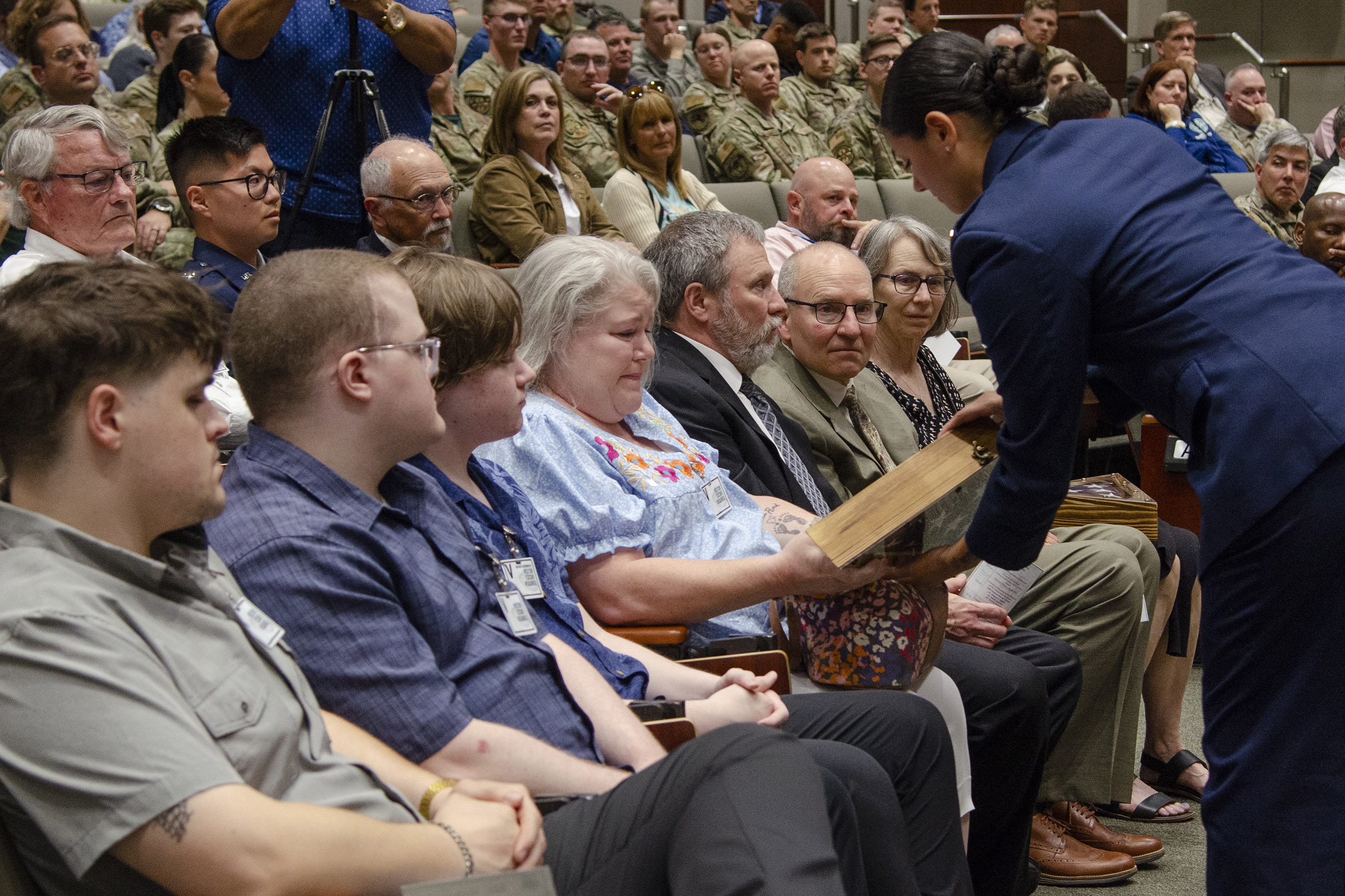 Jennifer Paynter (center) flanked by her sons Benjamin, Luke and Samuel, is presented with an engraved shadow box containing an American flag that was flown above the Air Force Technical Applications Center in memory of her husband, Lt. Col. (ret.) David Paynter, who passed away while actively serving at AFTAC as a federal civilian. (U.S. Air Force photo by Susan A. Romano)