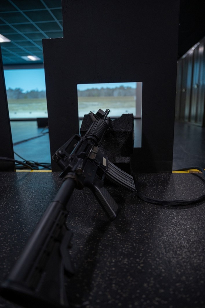 An M-4 replica lies pointed at the wall of the Engagement Skills Training room at Joint Base Langley-Eustis, Virginia, Jan. 23, 2026. Service members are encouraged to train at the EST where they can practice operating firearms, controlling their breathing, and improving their skills as a marksman in a simulated environment. (U.S. Air Force photo by Airman 1st Class Donnell Ramsey)