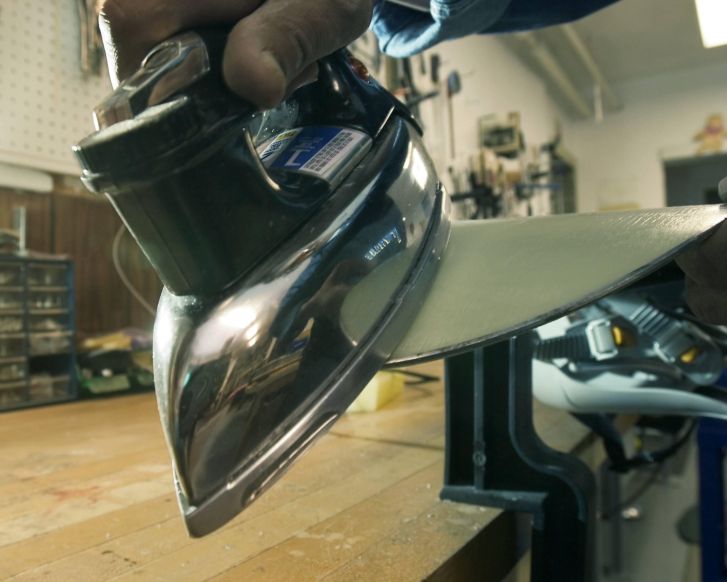 MOUNTAIN HOME AIR FORCE BASE, Idaho -- Raul Hernandez uses an iron to apply wax to the bottom of snowboards and skis. He cares for more than 600 pairs of skis, 100 snowboards and countless cross-country skis, snowshoes and sleds. (U.S. Air Force photo by Master Sgt. Lance Cheung)
