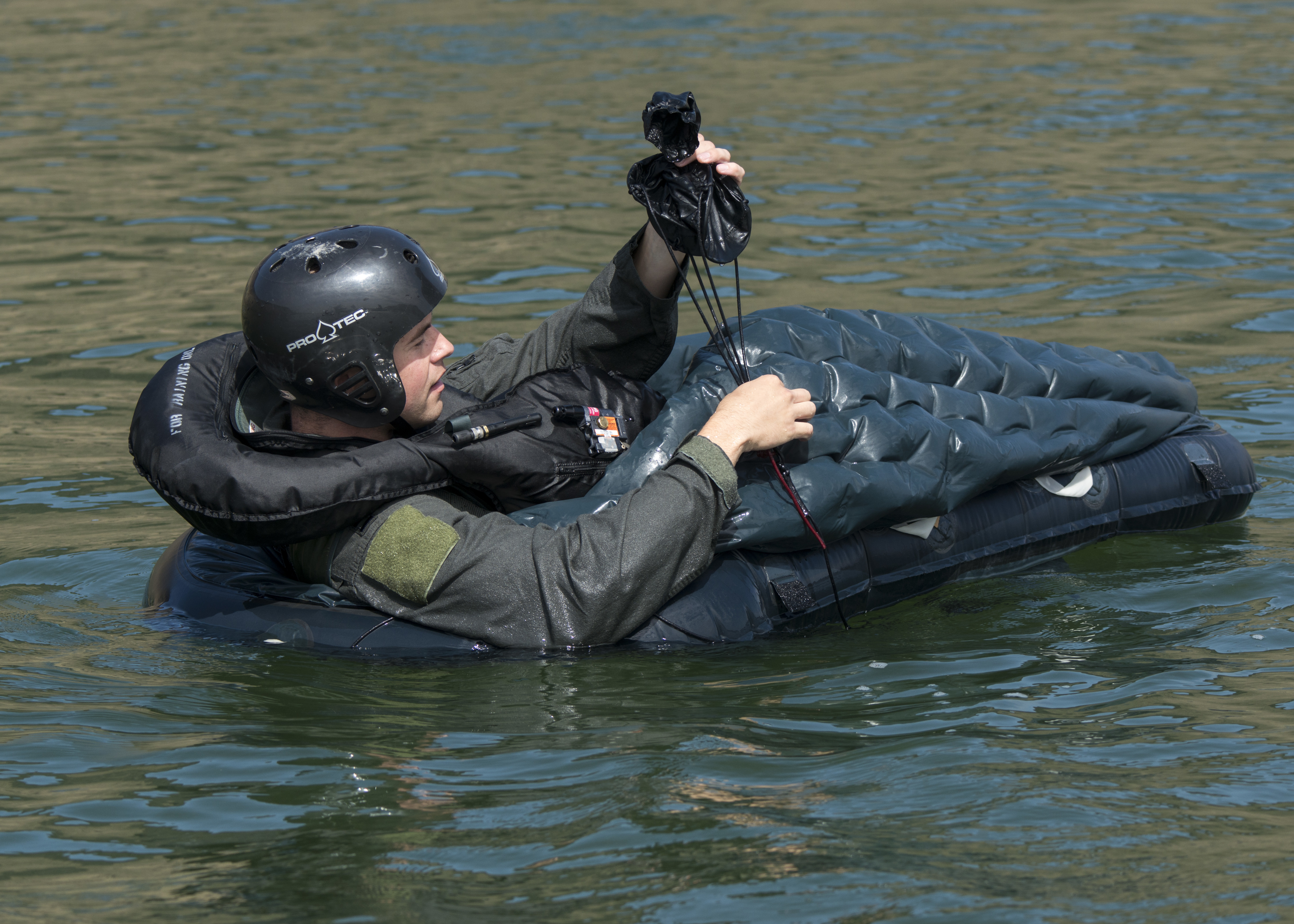 A 389th Fighter Squadron aircrew member pulling in his anchor to prep from sea extraction, Aug. 06, 2019 at C.J. Strike Reservoir, Idaho. Aircrew have multiple tools such as reflectors and strobe lights that can be used to signal other ships. (U.S. Air Force photo by Airman Antwain L. Hanks)