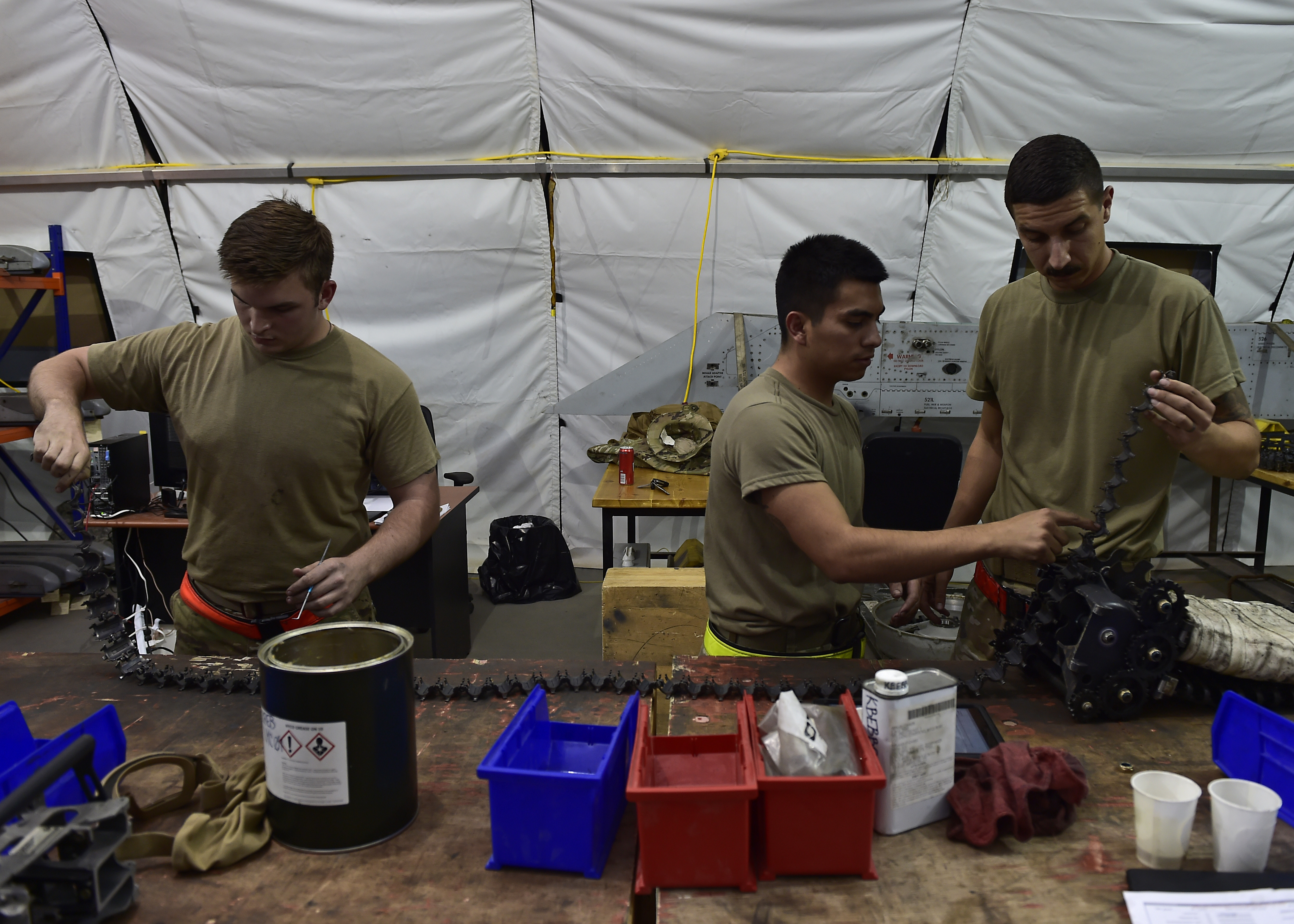 Airmen from the 378th Expeditionary Maintenance Squadron aircraft armament backshop conduct routine maintenance on a conveyer for an M61A1 20mm gun system for the F-15C Eagle at Prince Sultan Air Base, Kingdom of Saudi Arabia, Sept. 2, 2020. F-15C Eagles deployed to Prince Sultan Air Base provide air superiority in the region. (U.S. Air Force photo by Staff Sgt. Cary Smith)
