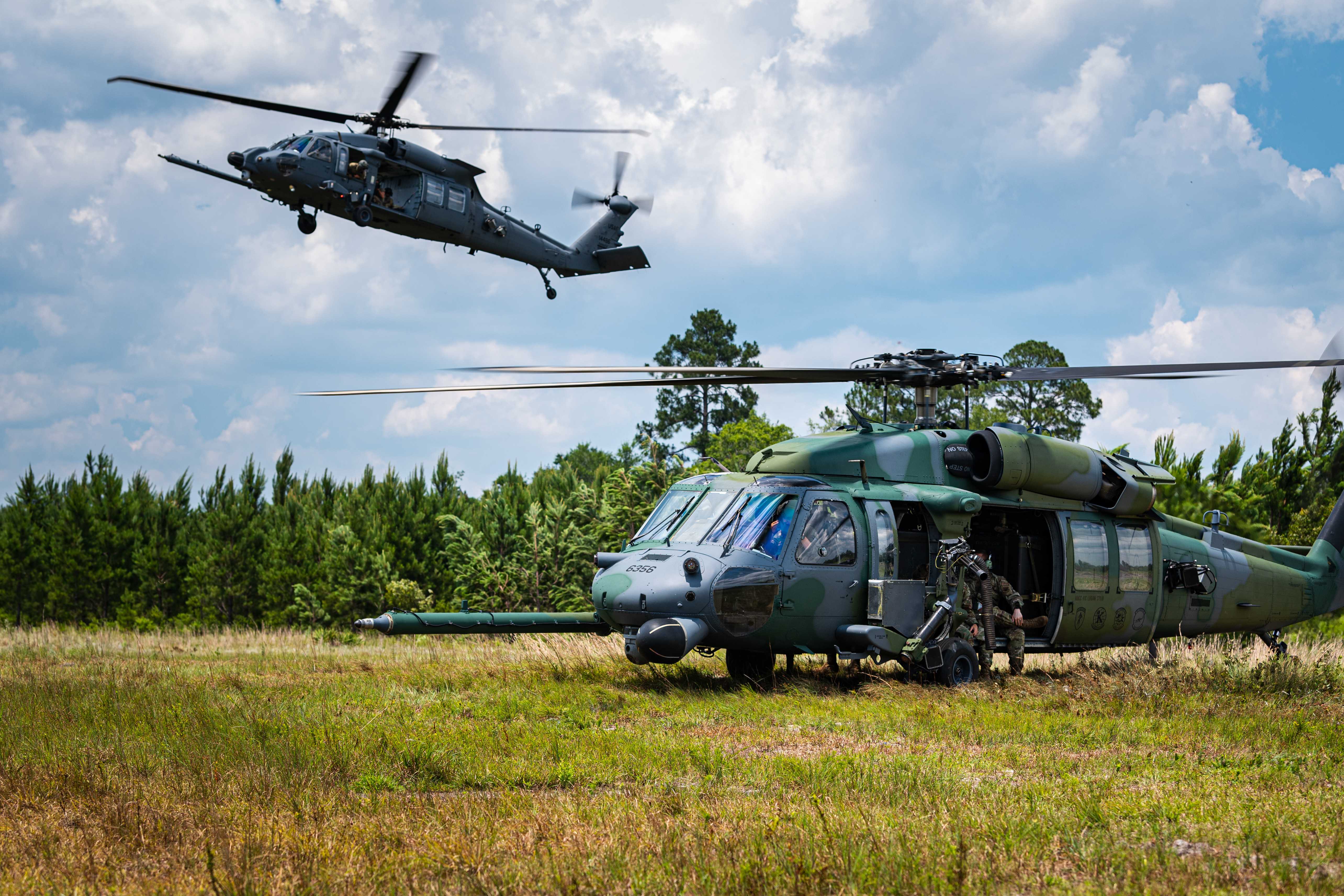 An HH-60W Jolly Green II, left, lands next to an HH-60G Pave Hawk during a Heritage Flight June 15, 2021, at Moody Air Force Base, Georgia. The Jolly Green II will replace the Pave Hawk, which has been flown for nearly 30 years. (U.S. Air Force photo by Senior Airman Hayden Legg)