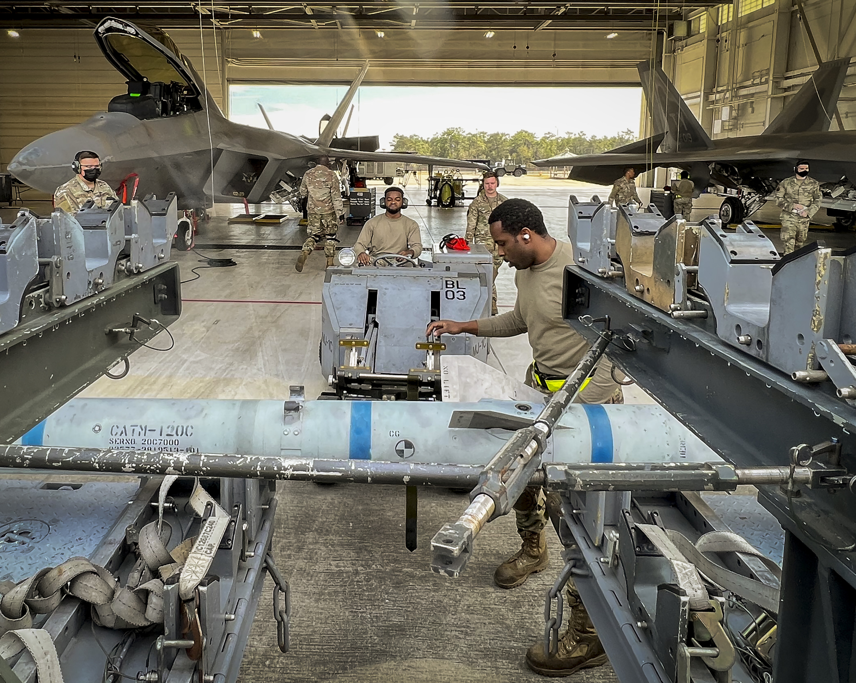 Staff Sgt. Donoven Wright, 43rd Fighter Generation Squadron, prepares to move an AIM-120 during the unit’s weapons load competition Feb. 11 at Eglin Air Force Base, Fla. Two teams competed to see who could load an AIM-120, an AIM-9 and chaff and flares onto their F-22 Raptor the fastest and with the fewest errors. The winner will be announced at the unit’s annual awards ceremony. (U.S. Air Force photo/Samuel King Jr.)