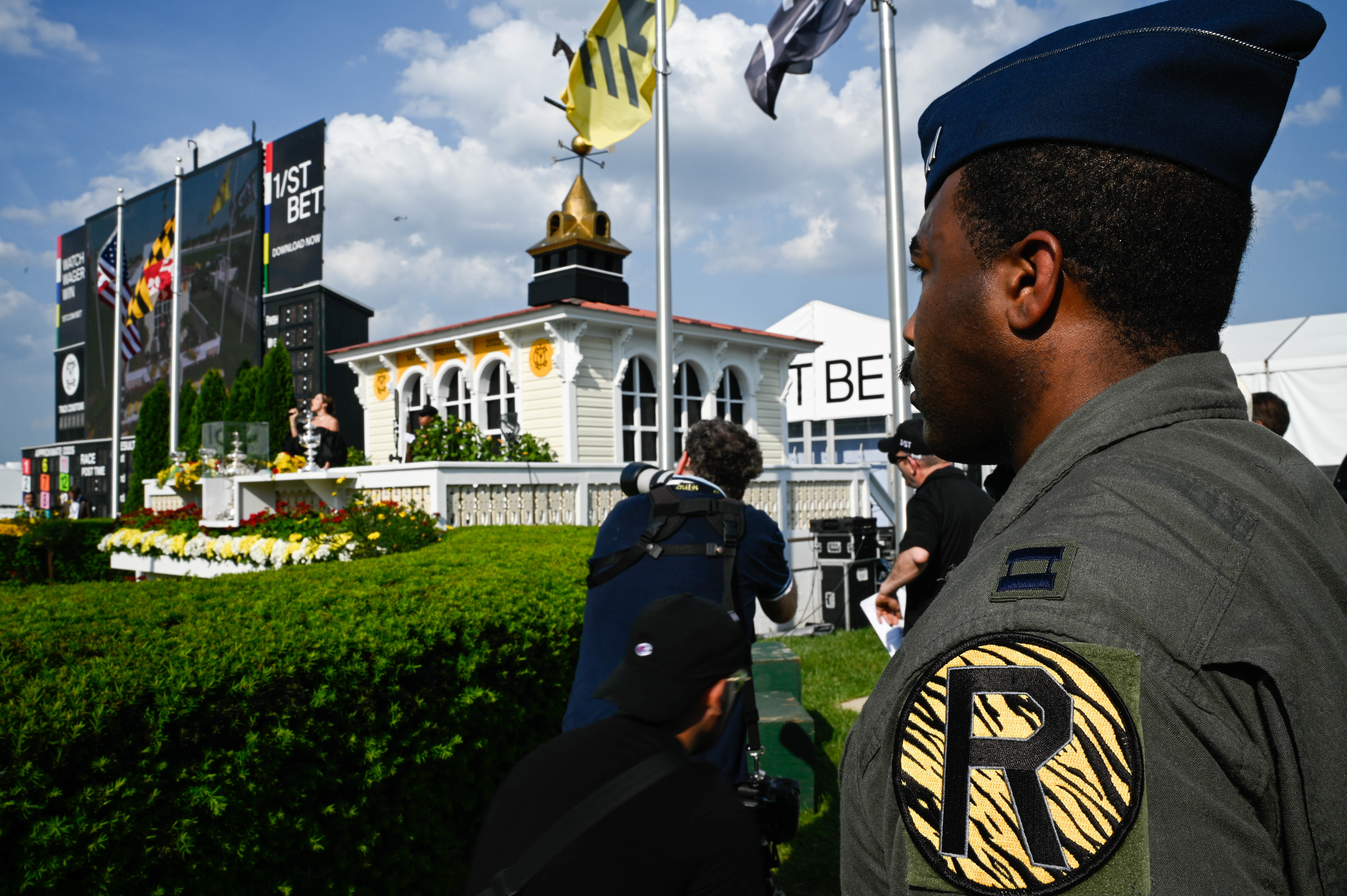 A U.S. Air Force B-2 Spirit pilot salutes during the National Anthem at the Pimlico race course, Baltimore, Maryland, May 21, 2022. The Preakness Stakes is an American thoroughbred horse race held on the third Saturday in May each year in Baltimore, Maryland. (U.S Air Force Photo by Senior Airman Christina Carter)