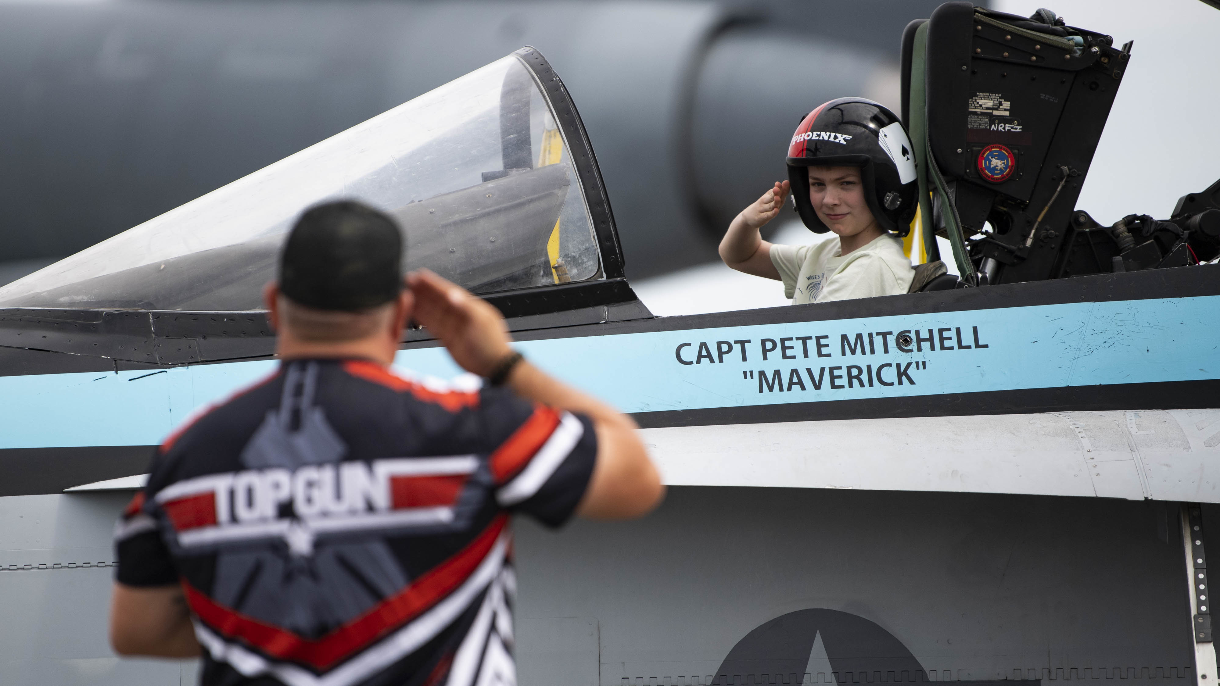 A spectator salutes while in a F-18 simulator during the 2022 Thunder Over Dover Airshow, May 22, 2022, at Dover Air Force Base, Delaware. The event was the first airshow and open house held at Dover AFB since September 2019. (U.S. Air Force photo by Tech. Sgt. J.D. Strong II)
