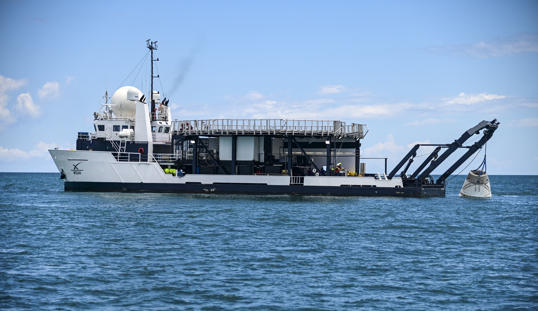 SpaceX Dragon recovery vessel Megan places a mock Orion capsule in the ocean for use in a DoD Validation exercise. The exercise was meant to validate the joint-capability of Navy helicopter squadrons and Air Force Guardian Angel Pararescue forces in their shared mission to recover astronauts at sea. (U.S. Space Command photo by Sean Castellano/Released)