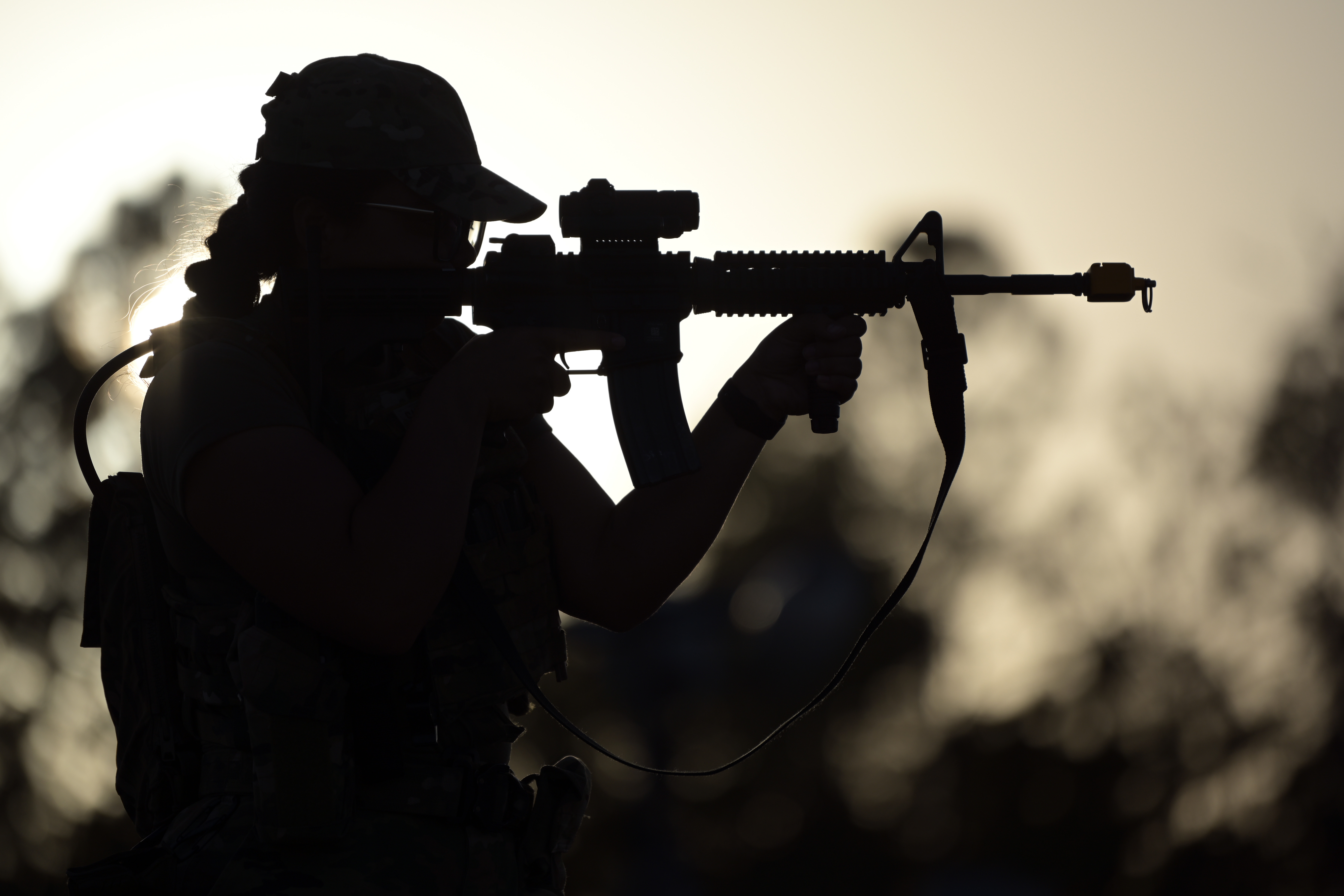 Airman 1st Class Laura Salgado, a security forces journeyman with the 156th Security Operations Squadron, aims down sights of an M4 carbine during a combat exercise at Southern Strike, Avon Park, Fla., April 24, 2022. Southern Strike 2022 is a large-scale, joint multinational combat exercise hosted by the Mississippi National Guard that provides tactical level training for the full spectrum of conflict. (U.S. Air National Guard photo by Master Sgt. Rafael Rosa)