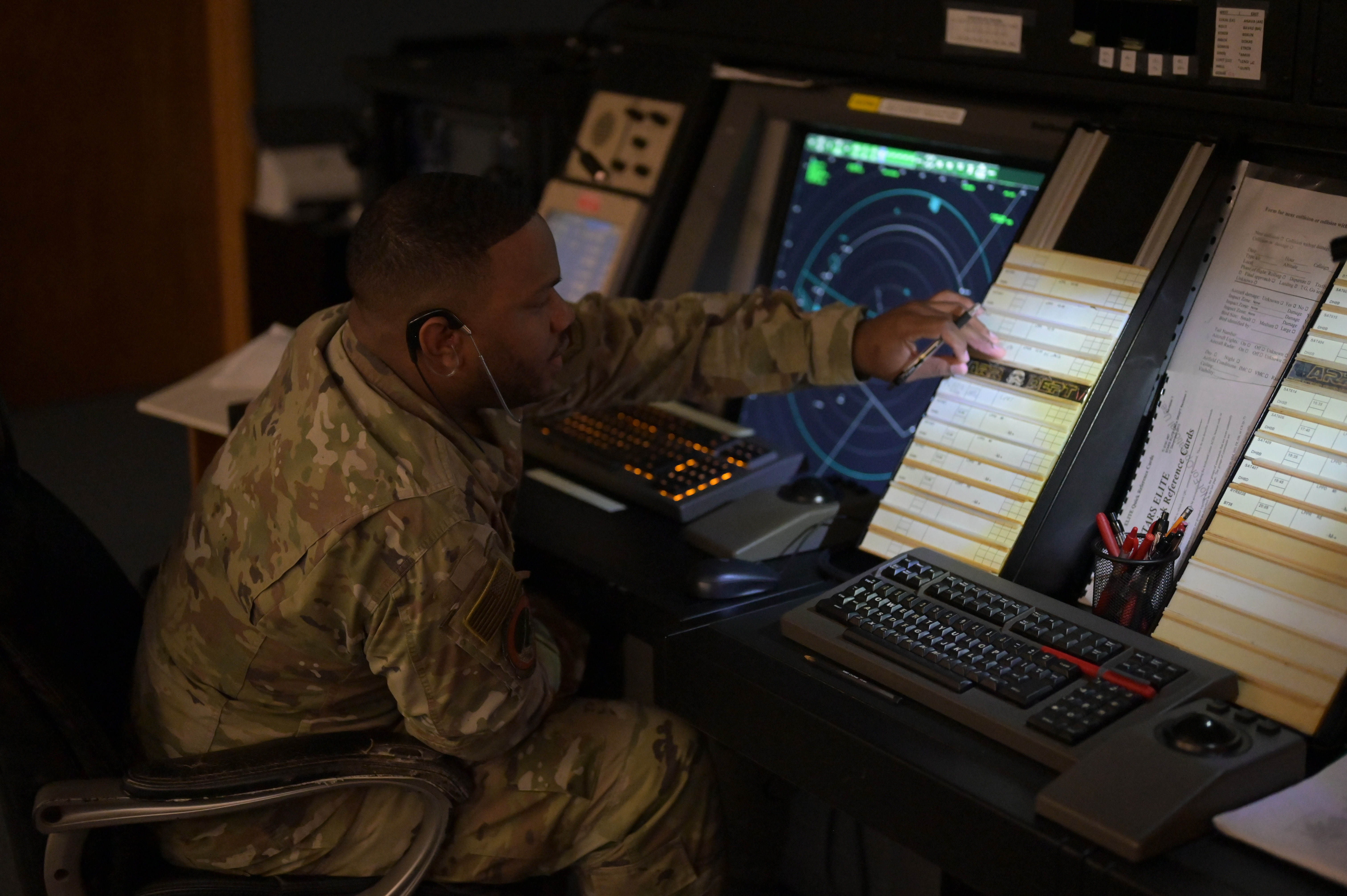 Staff Sgt. Dallas Moore, 65th Air Base Squadron Air Traffic Control watch supervisor, verifies flight progress strips in the Radar Approach Control facility at Lajes Field, Portugal, April 26, 2022. Air traffic controllers at RAPCON record the general information and intent of each aircraft on the strips. By monitoring this information and keeping constant communication with pilots, RAPCON ensures the safe arrival and departure of aircraft. (U.S. Air Force photo by Senior Airman John R. Wright)