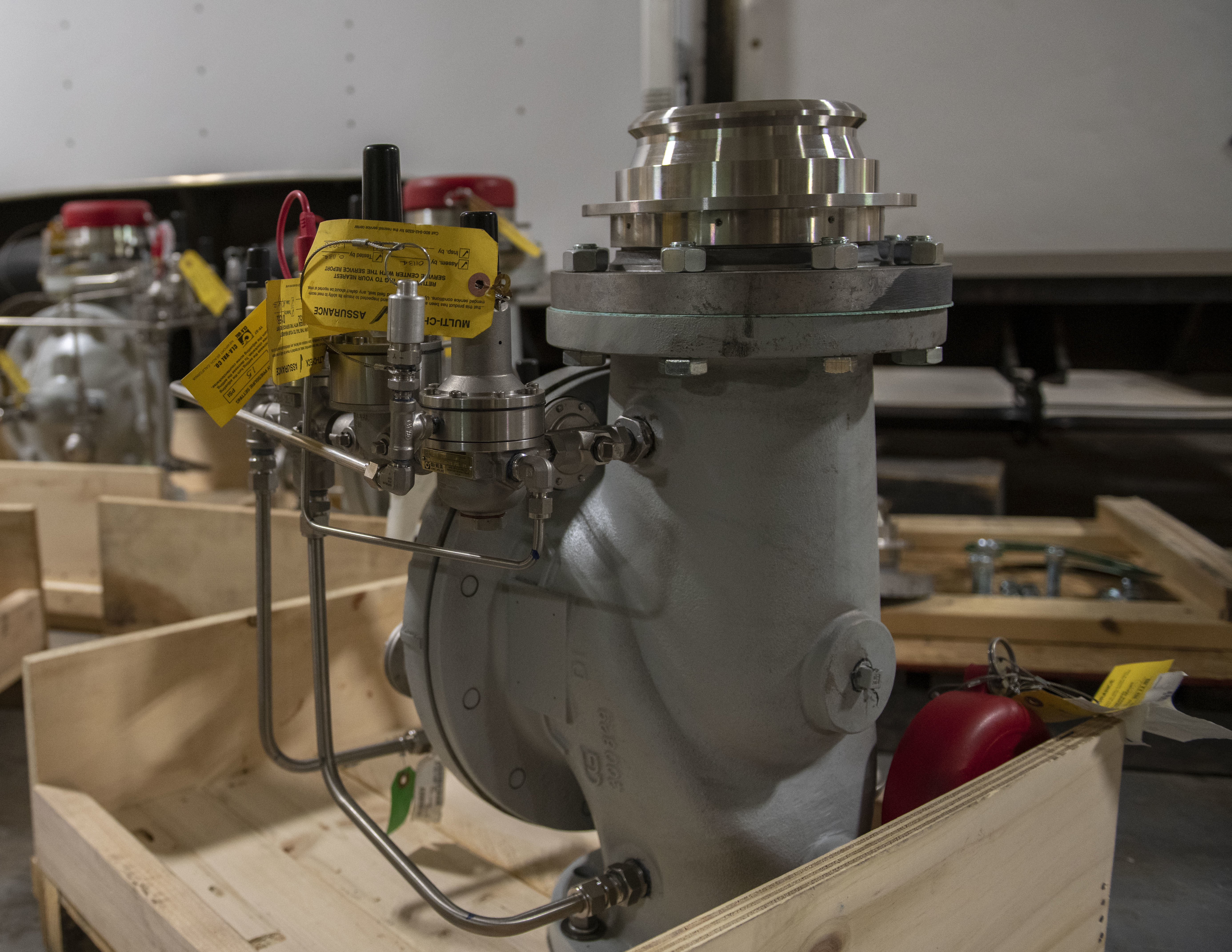 A new hydrant fuel valve sits in a warehouse, July 18, 2023, on Grand Forks AFB, North Dakota. The 319th Civil Engineer Squadron replaced hydrant fuel valves 20 years after the last major infrastructure upgrade. (U.S. Air Force photo by Airman 1st Class Raisa Christie)